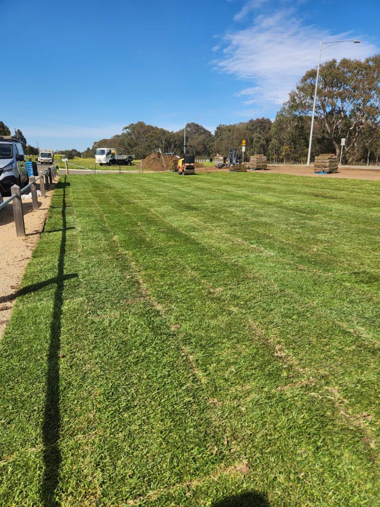 The type and quantity of top soil required for turf is very important as this will create the foundation for which the roots of your new turf will establish into. It is advisable to have at least 10cm of well worked soil. This can be achieved by rotary hoeing the existing soil. If there is minimal soil or you have poor quality soil, or a heavy clay base then additional good quality loamy top soil is required. A general rule is the more the better. This is because, if you install turf on top of a very small amount of soil, the roots of the turf dont have anywhere to go. This will not only comprise the establishment and growth efficiency of your lawn but will affect its drought tolerance and hard watering capabilities. Once soil is down, make sure the entire area is covered to ensure a smooth, even surface and allow about 2.5cm below paths or driveways for the thickness of the turf so it ends up flush.